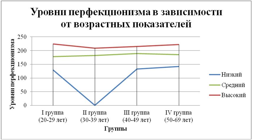 Далее нами рассматривался перфекционизм как одна из форм профессионального выгорания. Для определения уровня перфекционизма использовалась многомерная шкала перфекционизма П. Хьюитта и Г. Флетта (рис. 3). Во II возрастной группе преобладает низкий уровень перфекционизма. Он имеет направленность на себя. Это говорит о том, что педагоги в возрасте от 30 до 39 лет, в основном, ориентированы на личностное развитие. В этот время педагог предъявляет высокие требования к себе, происходит расцвет карьеры. Это тенденция устанавливать для себя более завышенные, чем у других, планки в исполнении чего-либо на фоне неспособности принимать и прощать себе несовершенство или ошибки при исполнении своей работы.