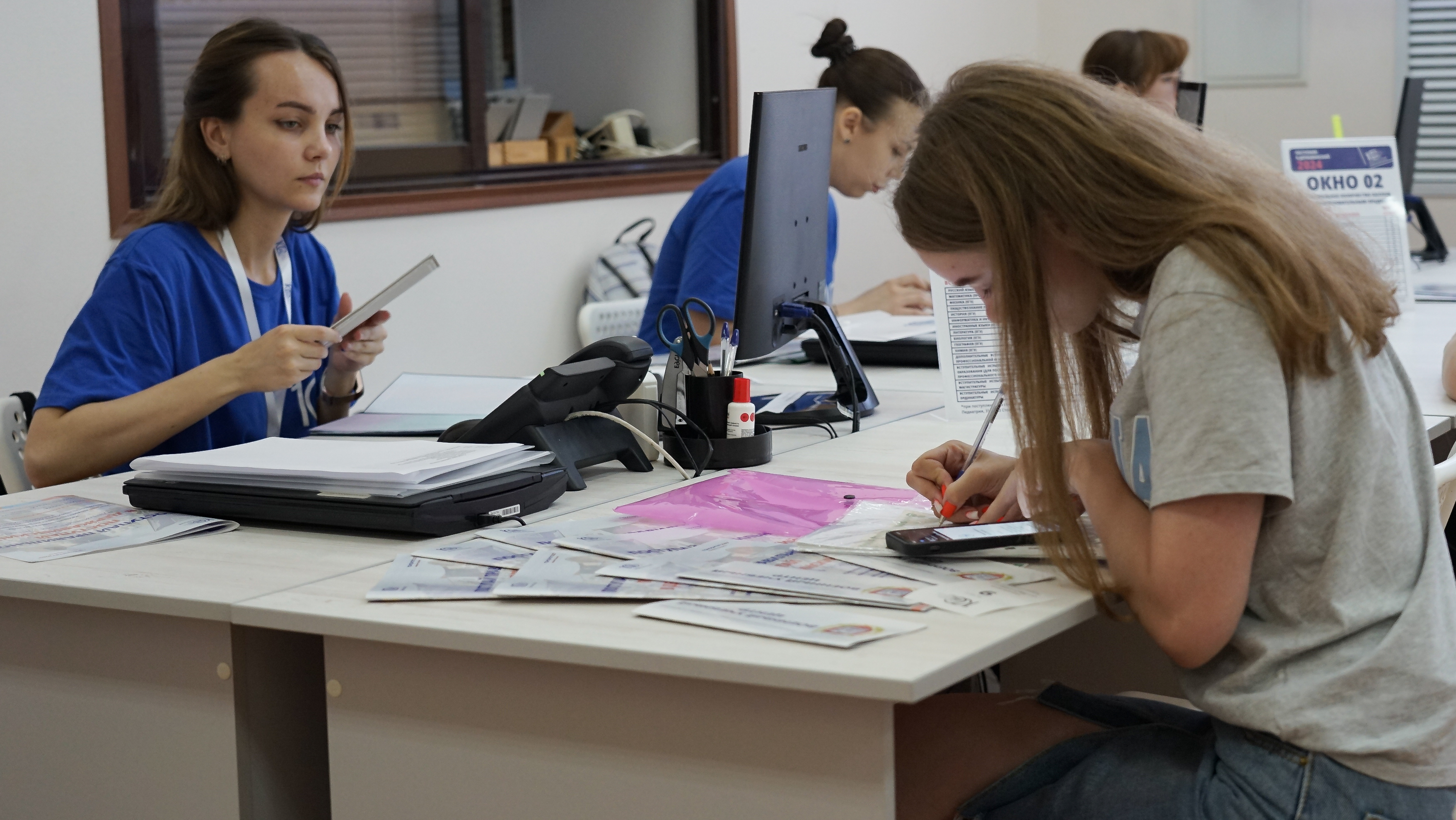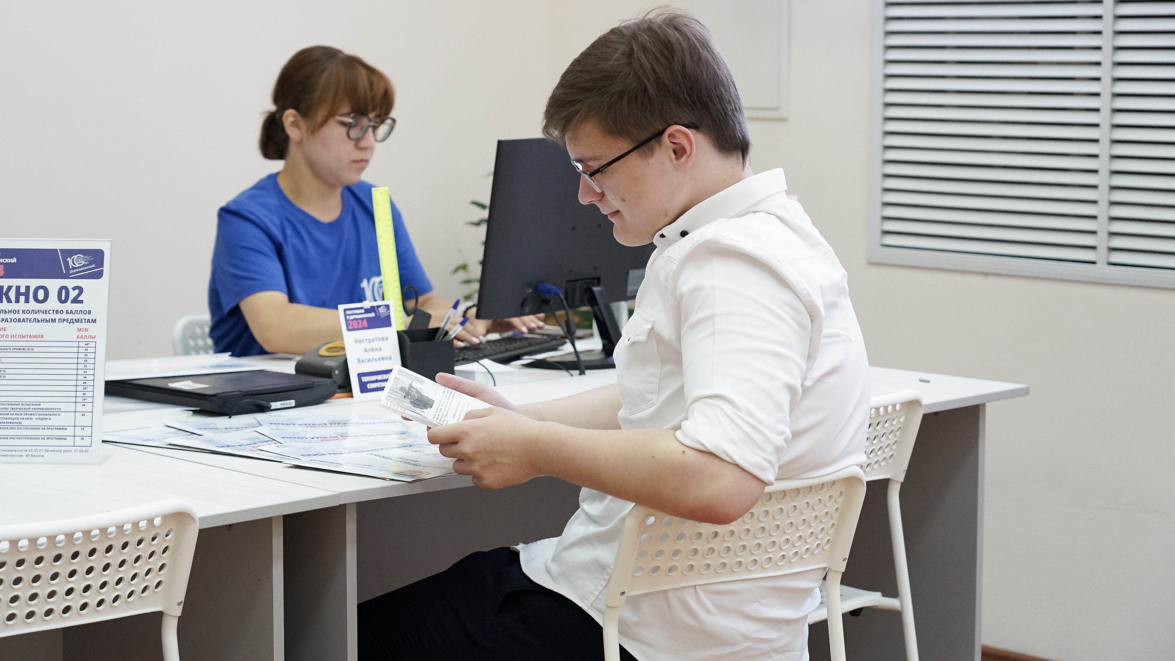 В 2024 году приемная комиссия Державинского работает по принципу МФЦ. Абитуриент через терминал получает талон с номером и местом в очереди. Экран в зале ожидания подскажет, когда можно подойти с документами к секретарю приемной комиссии.