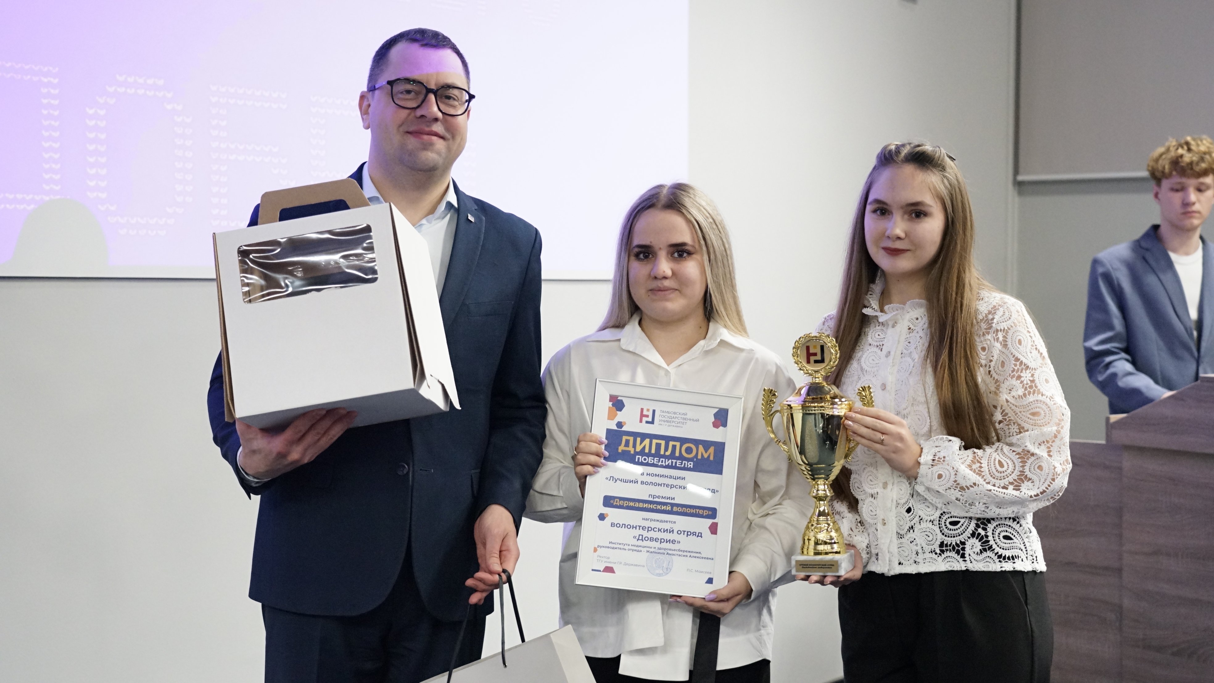 Благодарственными письмами Державинского университета отмечен вклад в развитие добровольческих инициатив студентов: Дарьи Шевченко, Анастасии Жалниной, Виктории Цыбяковой, Данилы Родионова, Даниила Прудникова.