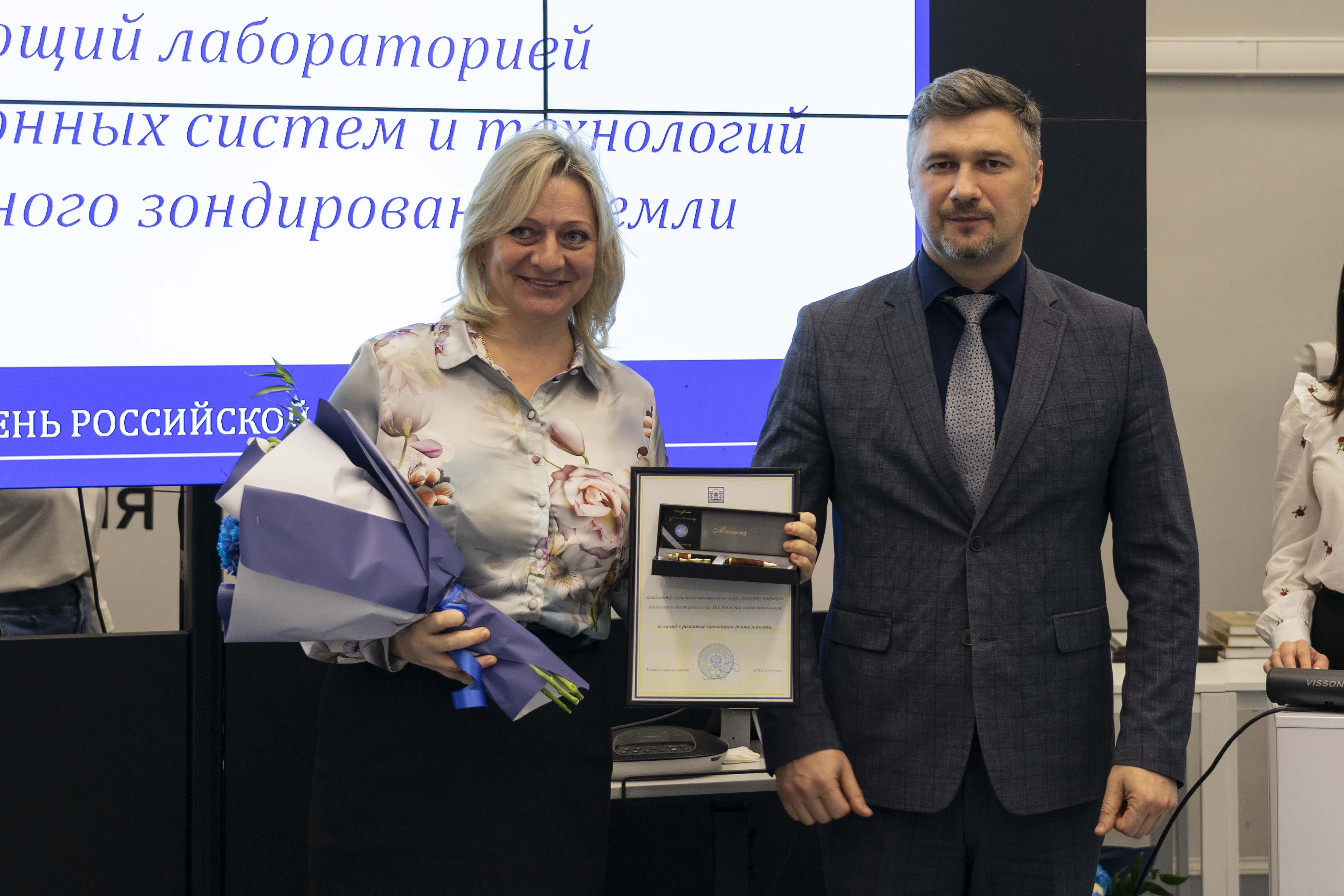 За структурно-аналитическую работу по программе «Приоритет 2030» ректор Владимир Стромов наградил директора Проектного офиса Державинского университета Марину Медведеву.