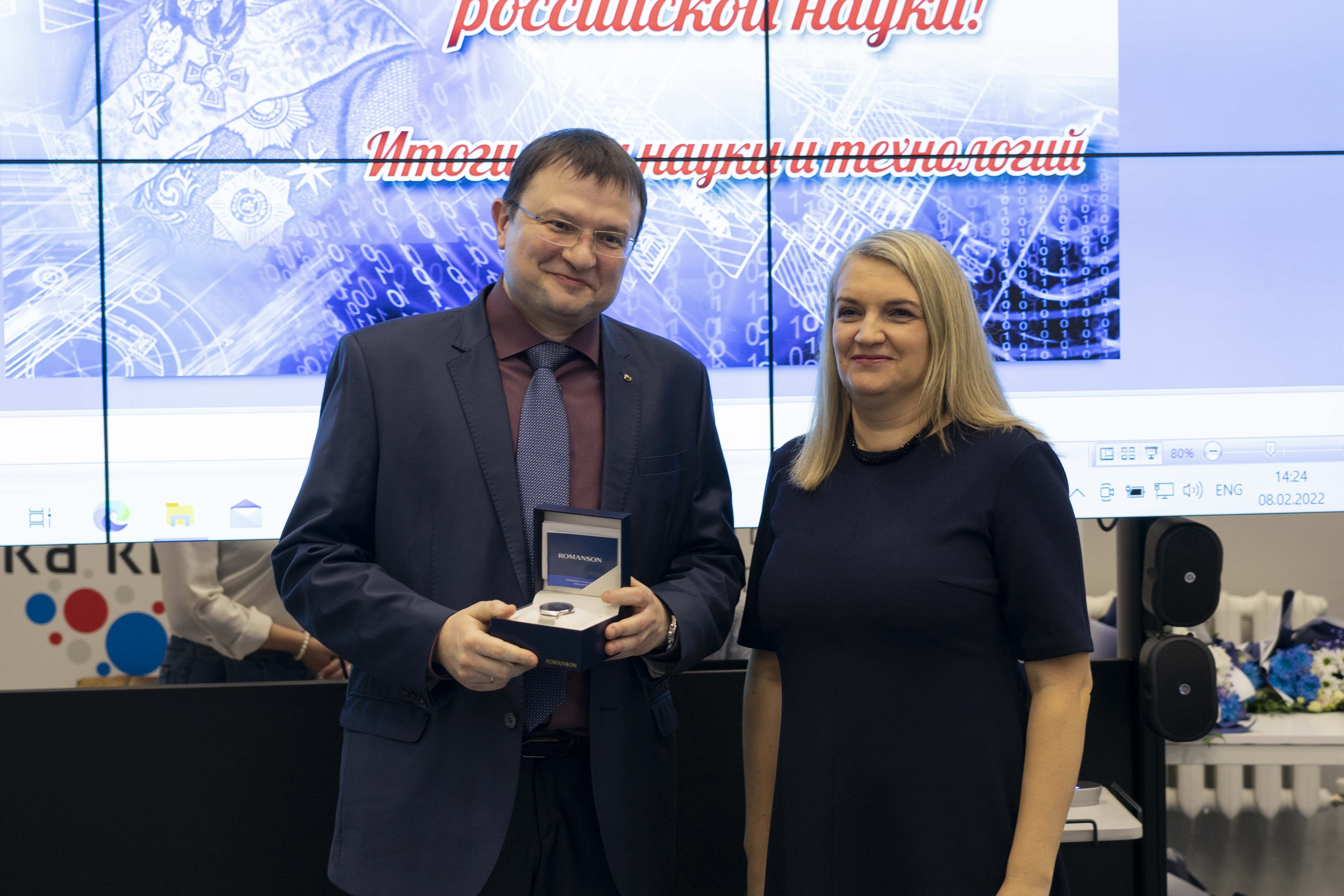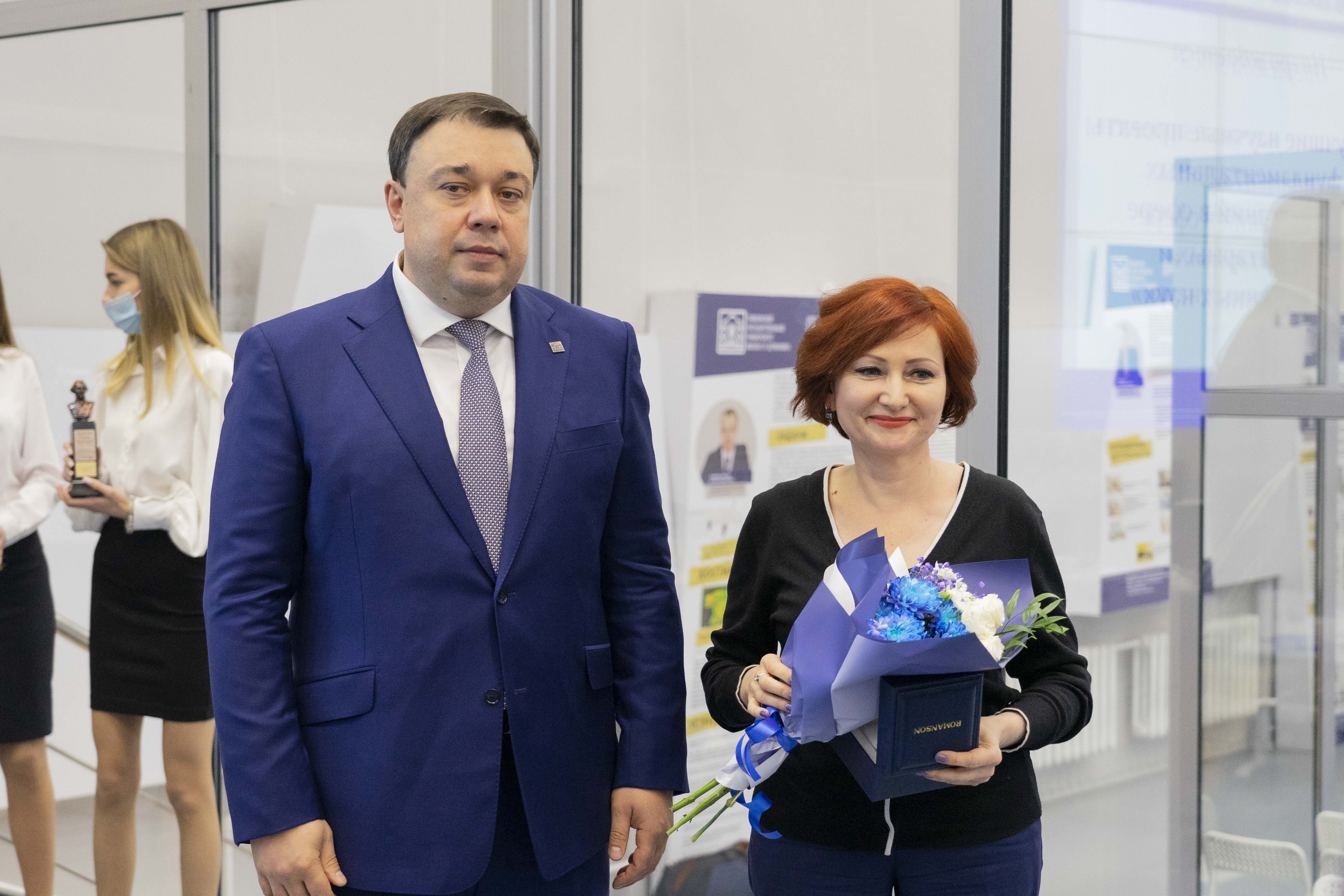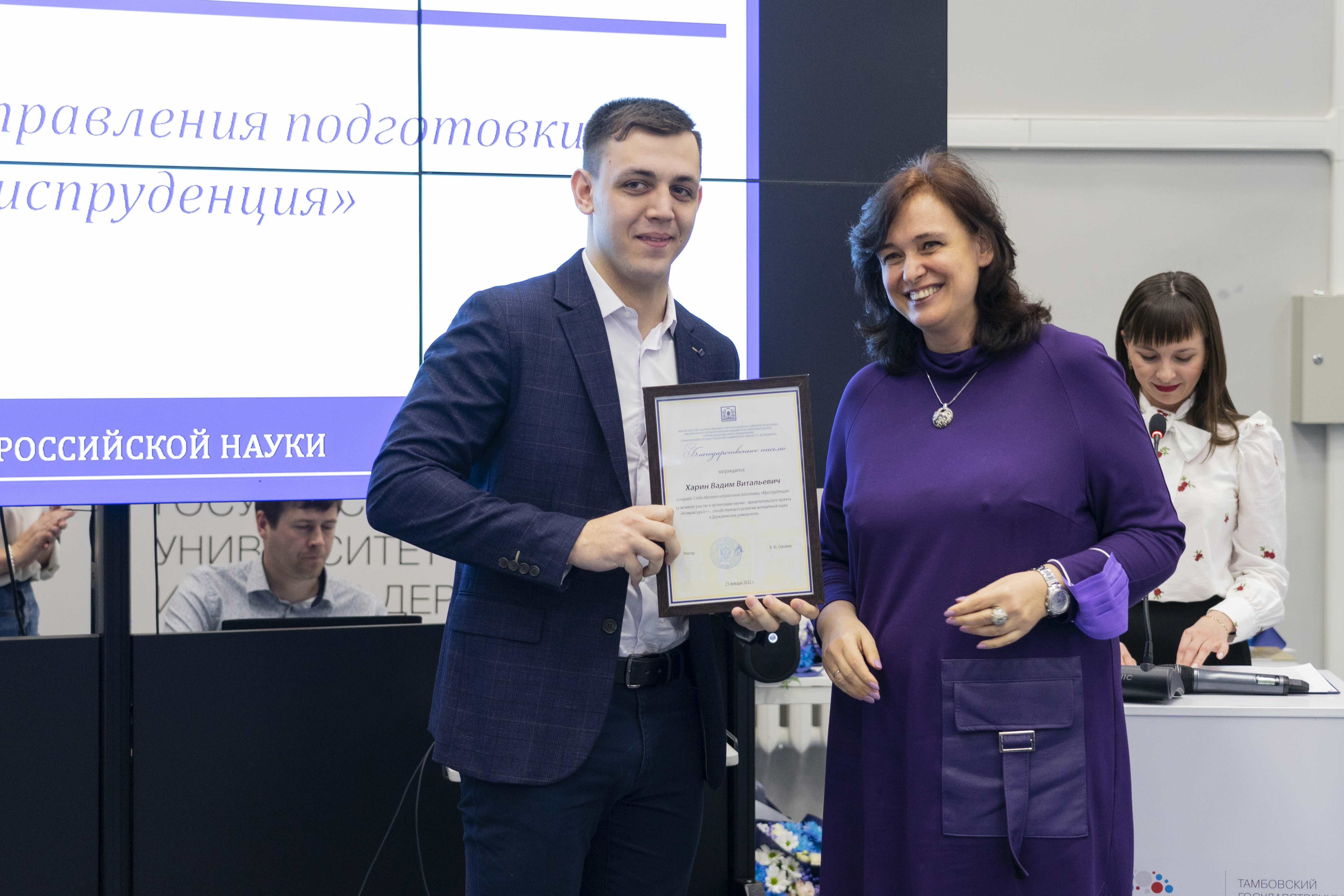 В этот день чествовали ученых Державинского, которые внесли вклад в развитие науки. За лучшие научные проекты фундаментальных исследований в сфере гуманитарных наук наградили д.и.н., профессора Валерия Канищева, д.п.н., профессора Дмитрия Сельцера, д.ю.н., доцента Василия Трофимова, к.и.н., доцента Дмитрия Жукова, д.филол.н., профессора Екатерину Звереву, к.пед.н., доцента Татьяну Дьякову. За эффективную организацию научно-исследовательской деятельности университетского Центра коллективного пользования отметили д.ф.-м.н. Александра Дмитриевского. За развитие прикладной науки в университете наградили д.м.н., доцента Олега Ямщикова. За разработку рецептуры экологичной смолы для склеивания древесных материалов награду вручили руководителю Центра перспективных химических технологий Алексею Абрамову и магистранту направления подготовки «Химия» Виктории Брыксиной. Директора Испытательного центра Державинского университета, к.ф.-м.н. Алексея Шуклинова отметили за разработку в составе научного коллектива уникального прибора для исследования в области онкологии. За вклад в развитие проектной деятельности наградили директора университетского Центра компетенций в сфере применения беспилотных авиационных систем Артема Киреева, старшего научного сотрудника конструкторского бюро «Телекоммуникационные системы» Александра Назарова, зав.лабораторией геоинформационных систем и технологий дистанционного зондирования Земли Эльгюна Гусейнова, к.с.-х.н., доцента Наталью Бородину. За эффективное руководство аспирантами отметили д.пед.н., профессора Павла Сысоева. На торжественном собрании наградили аспирантов за активное участие и организацию научно-просветительского проекта «Аспирантура 0+»: Вадима Харина, Валерию Хворову, Георгия Махрачева.