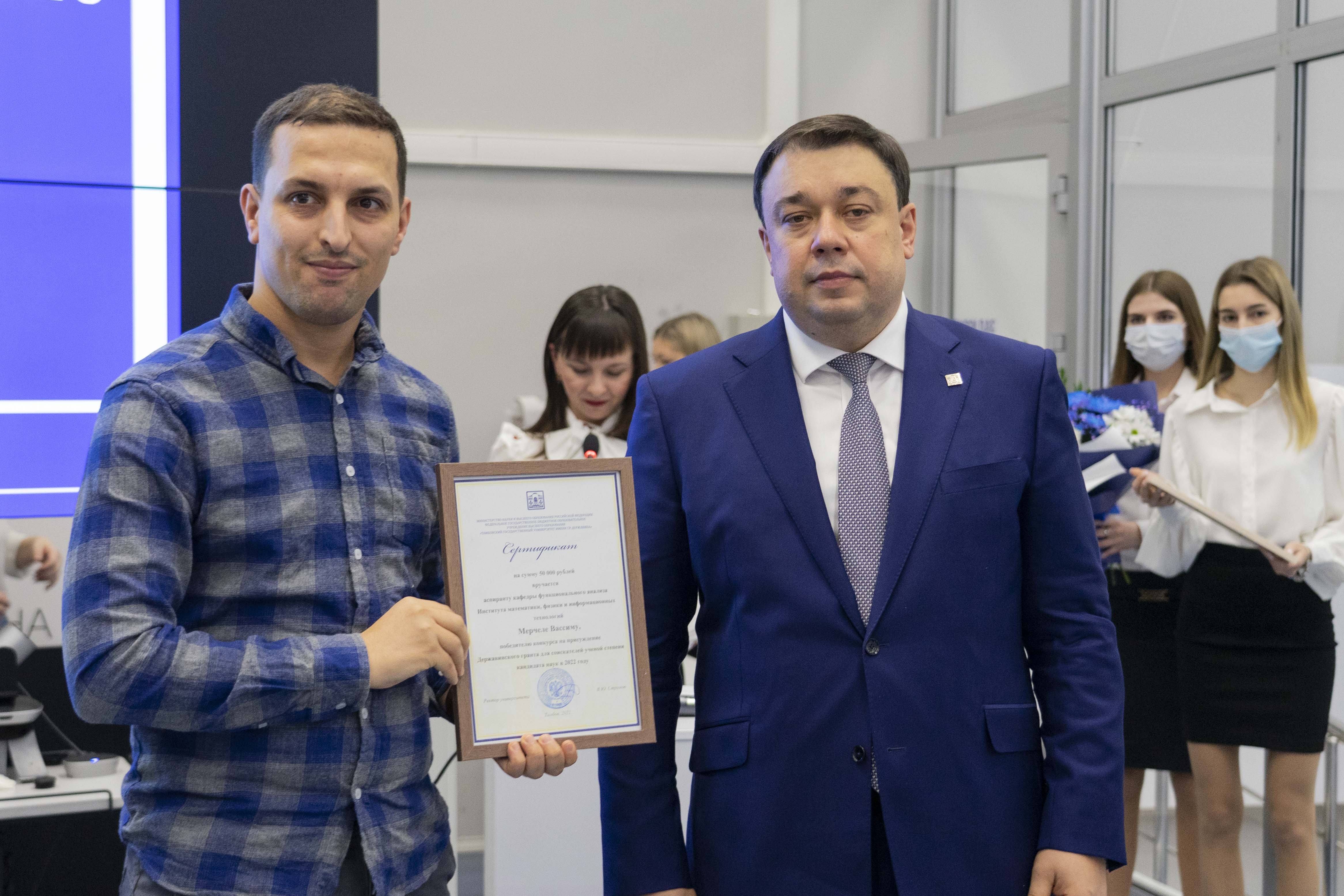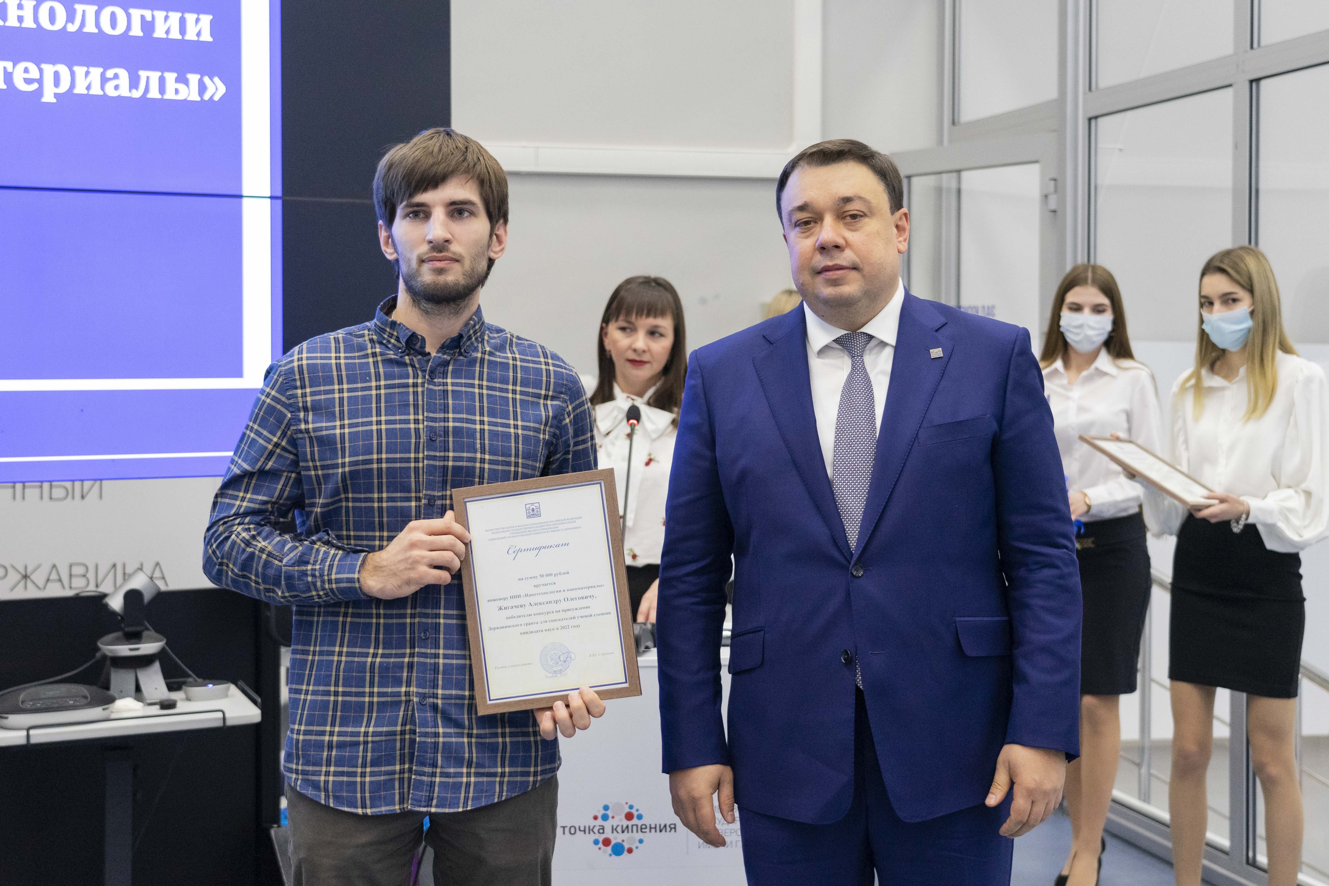 В День науки объявили победителей внутриуниверситетского конкурса на присуждение Державинских грантов молодым ученым и научным коллективам. По инициативе ректора Владимира Стромова гранты выделяют ежегодно за достижения в научно-исследовательской деятельности, а также на проведение прикладных научных исследований. Державинским грантом для молодых ученых в номинации «Гуманитарные и общественные науки» в размере 100 000 рублей наградили к.э.н., доцента Юлию Немтинову, к.э.н., доцента Ирину Чепурову, к.э.н., доцента Маргариту Сысоеву, к.ю.н., доцента Ангелину Лапаеву. Грантом в номинации «Естественные и технические науки» в размере 100 000 рублей наградили д.т.н., профессора Сергея Ковалева. Державинским грантом для поддержки соискателей ученой степени кандидата наук в размере 50 000 рублей наградили инженера НИИ «Нанотехнологии и наноматериалы» Александра Жигачева, аспирантов Вассима Мерчела и Сарру Бенараб, ст.преподавателя Марию Анурьеву и ассистента Екатерину Талалаеву.